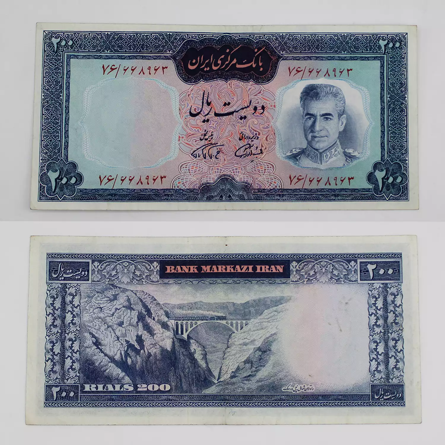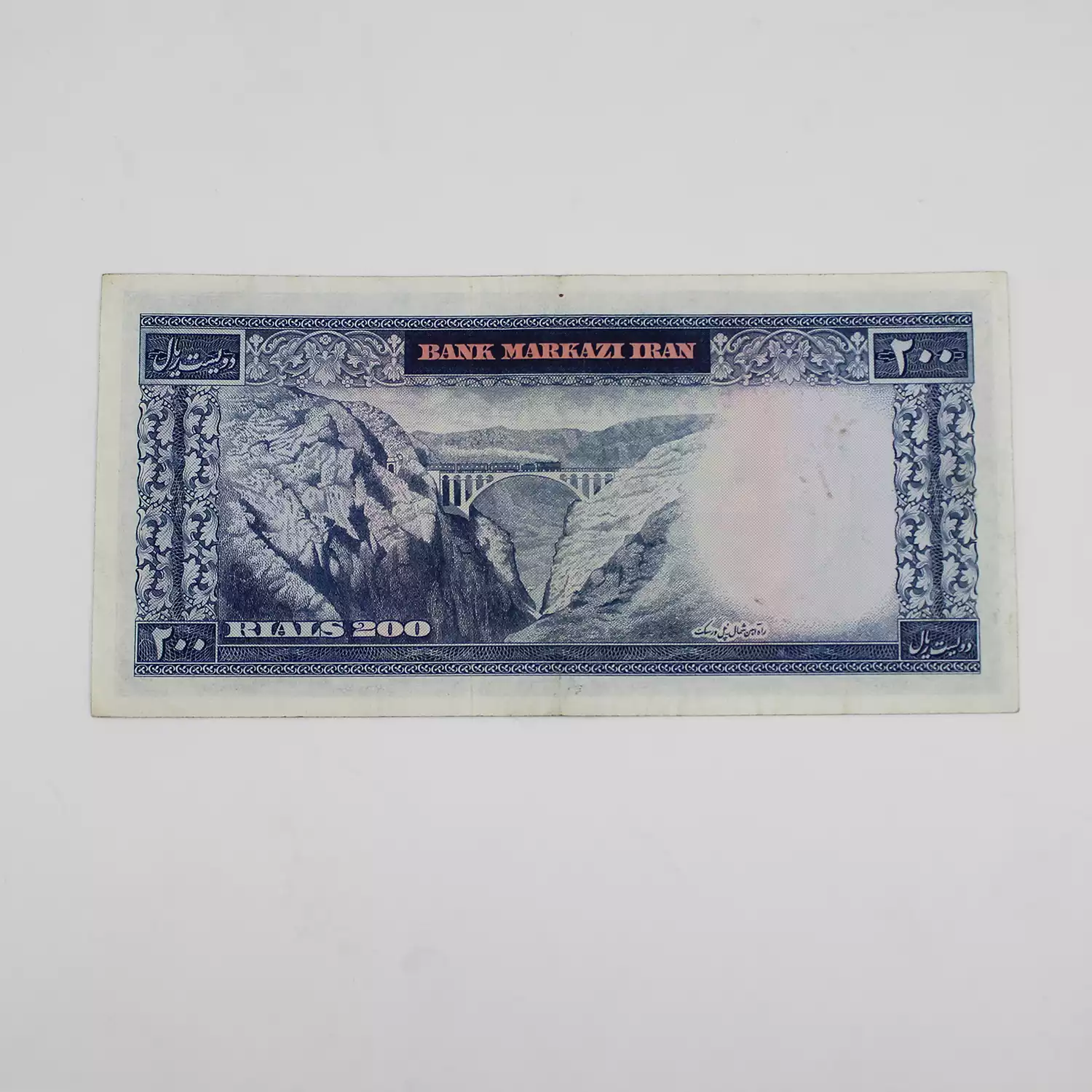 قیمت 20 تومانی فرمان بالا قرمز، اسکناس 200 ریالی فرمان آموزگار، دویست ریالی پهلوی سری هفتم محمدرضا شاه پهلوی، پشت اسکناس: پل ورسک