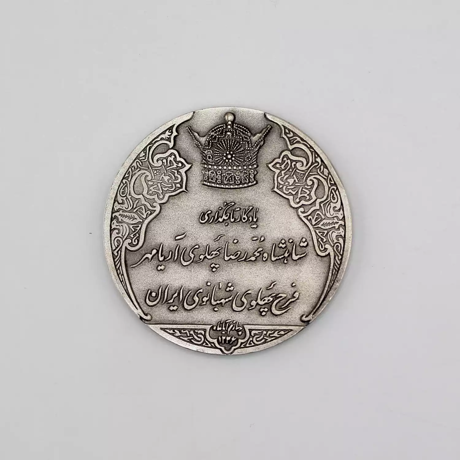 قیمت مدال نقره انقلاب سفید، مدال یادبود انقلاب سفید محمدرضا شاه پهلوی، جنس: نقره 925، وزن: 39.75 گرم، قطر: 45 میلیمتر، تاجگذاری محمدرضا شاه و فرح پهلوی